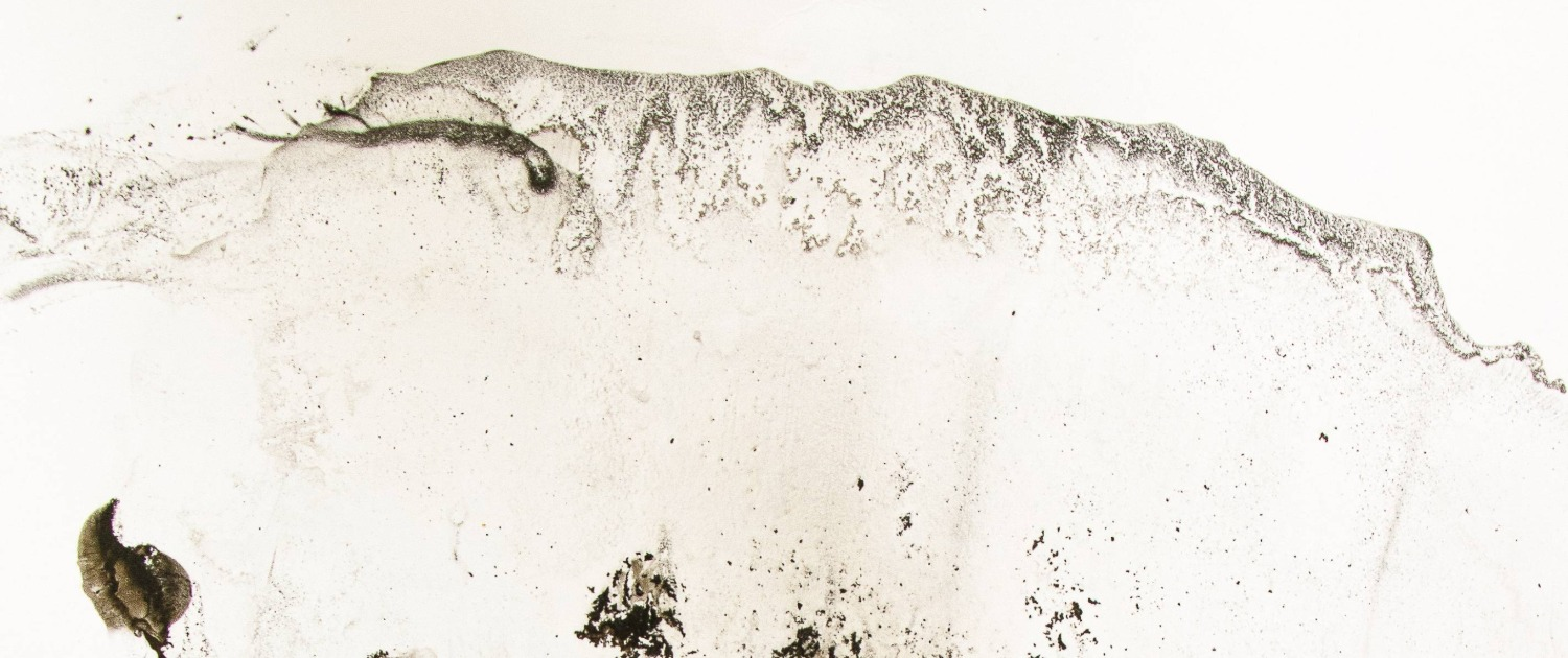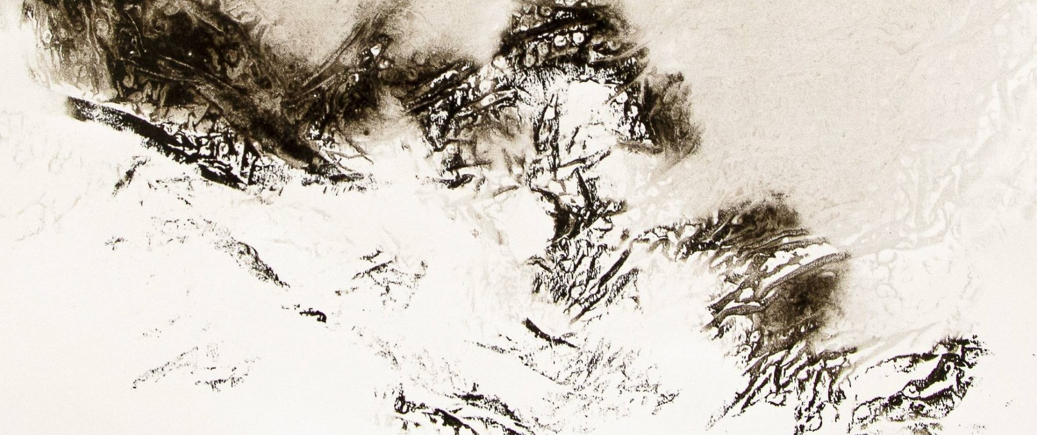 Élisabeth Mounic, formée aux Beaux-Arts de Tarbes et nourrie des maîtres orientaux et occidentaux, répond à cette géologie arctique par des encres sur papier où le geste calligraphique fait écho aux strates glaciaires. Ses lignes mouvantes, ses noirs profonds, ses nuances froides prolongent les vibrations chromatiques des photographies. Au-delà de la représentation des choses, il s’agit d’une expression abstraite basée sur le geste qui donne au trait toute son expression.