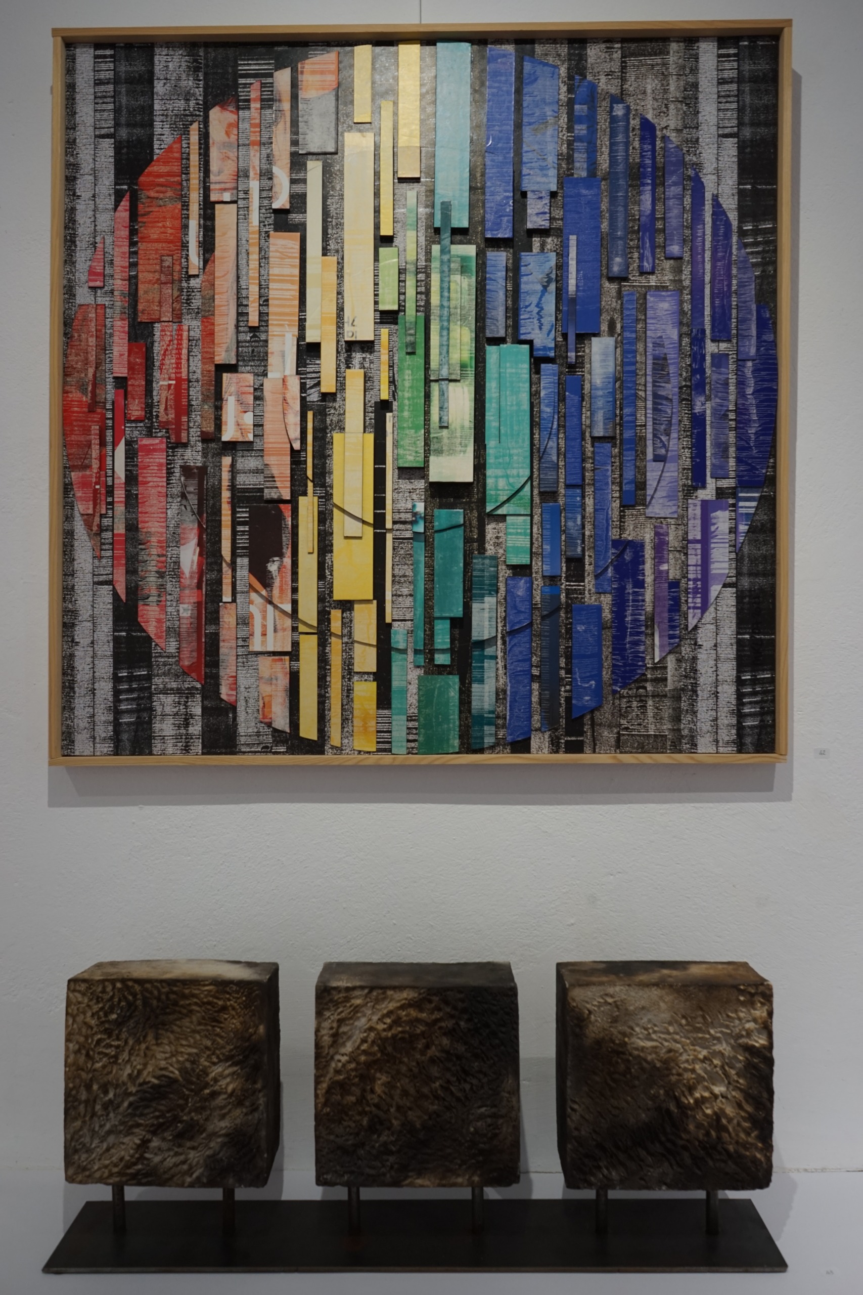 Du format le plus petit (10 x 10 cm) au plus grand (réalisation in situ d’un panneau permanent de 270 x 290 cm), cette démarche est le fruit d’une réflexion menée depuis plusieurs années. Les tableaux, en deux ou trois dimensions, ont tous pour fil conducteur, la matière et la trace laissée sur le papier.