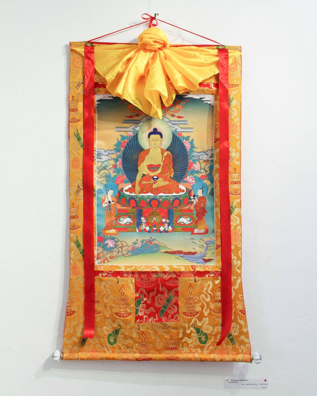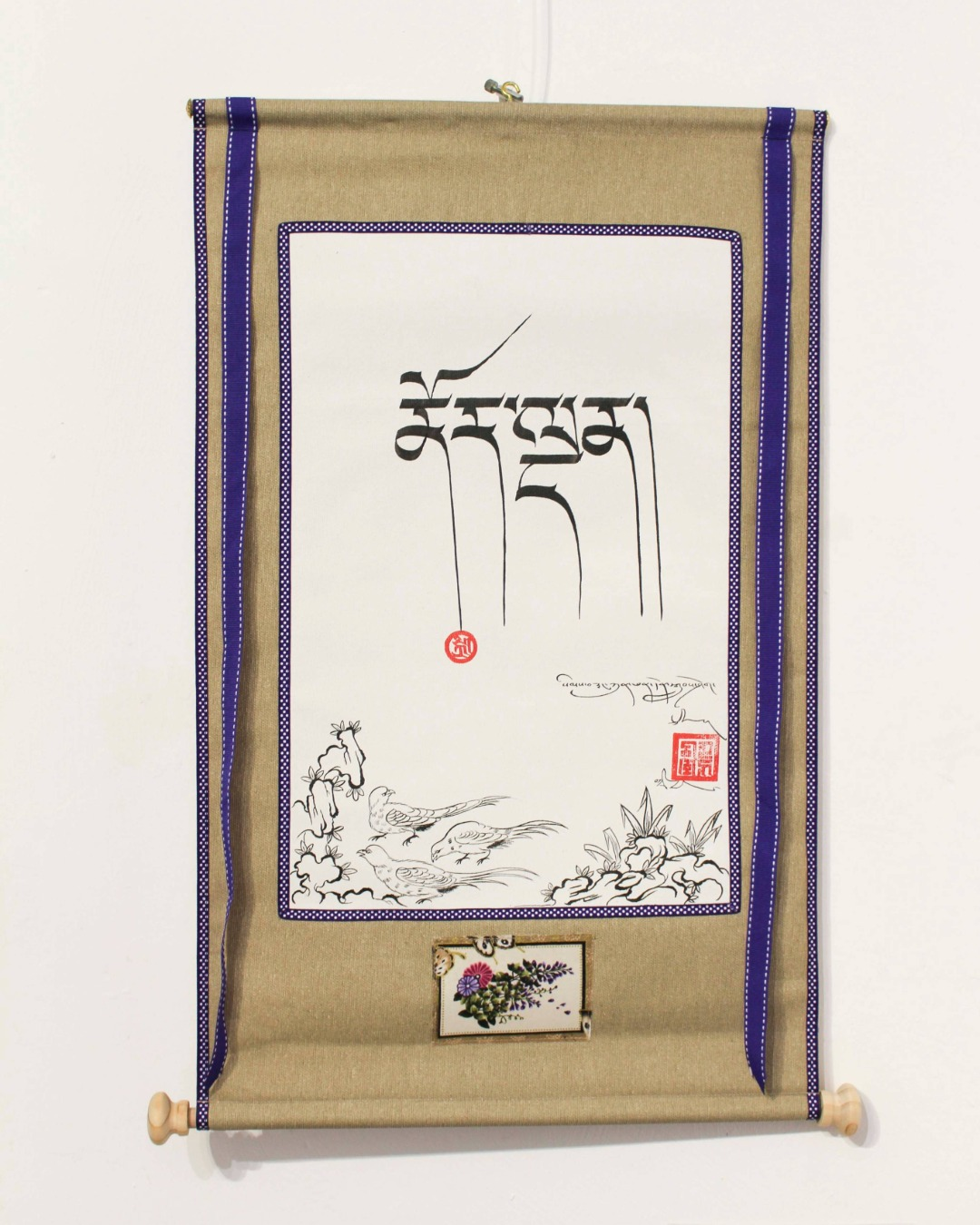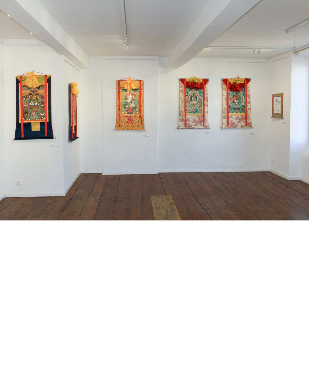 L’exposition présente des reproductions de thangkas réalisées à partir des œuvres originales de l’artiste, imprimées sur coton enduit et réinterprétées avec un subtil clin d’œil à la culture française par l’usage de la toile de Jouy. Elles dialoguent avec des calligraphies issues des textes bouddhistes, où chaque trait, chaque couleur et chaque figure participe d’un langage symbolique invitant à la contemplation et à la transmission.
