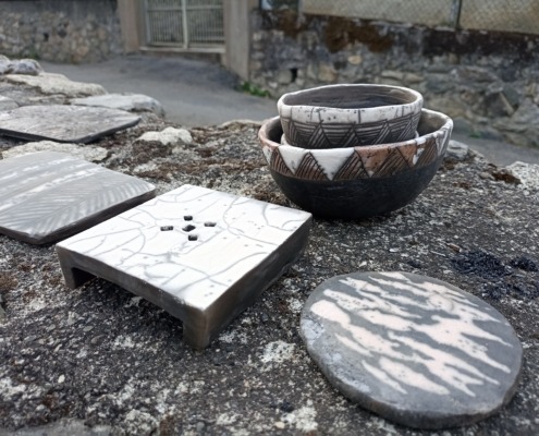 Pratique : Préparation et pose de l’engobe de séparation, de l’émail. | Cuissons raku. | Finitions des pièces.