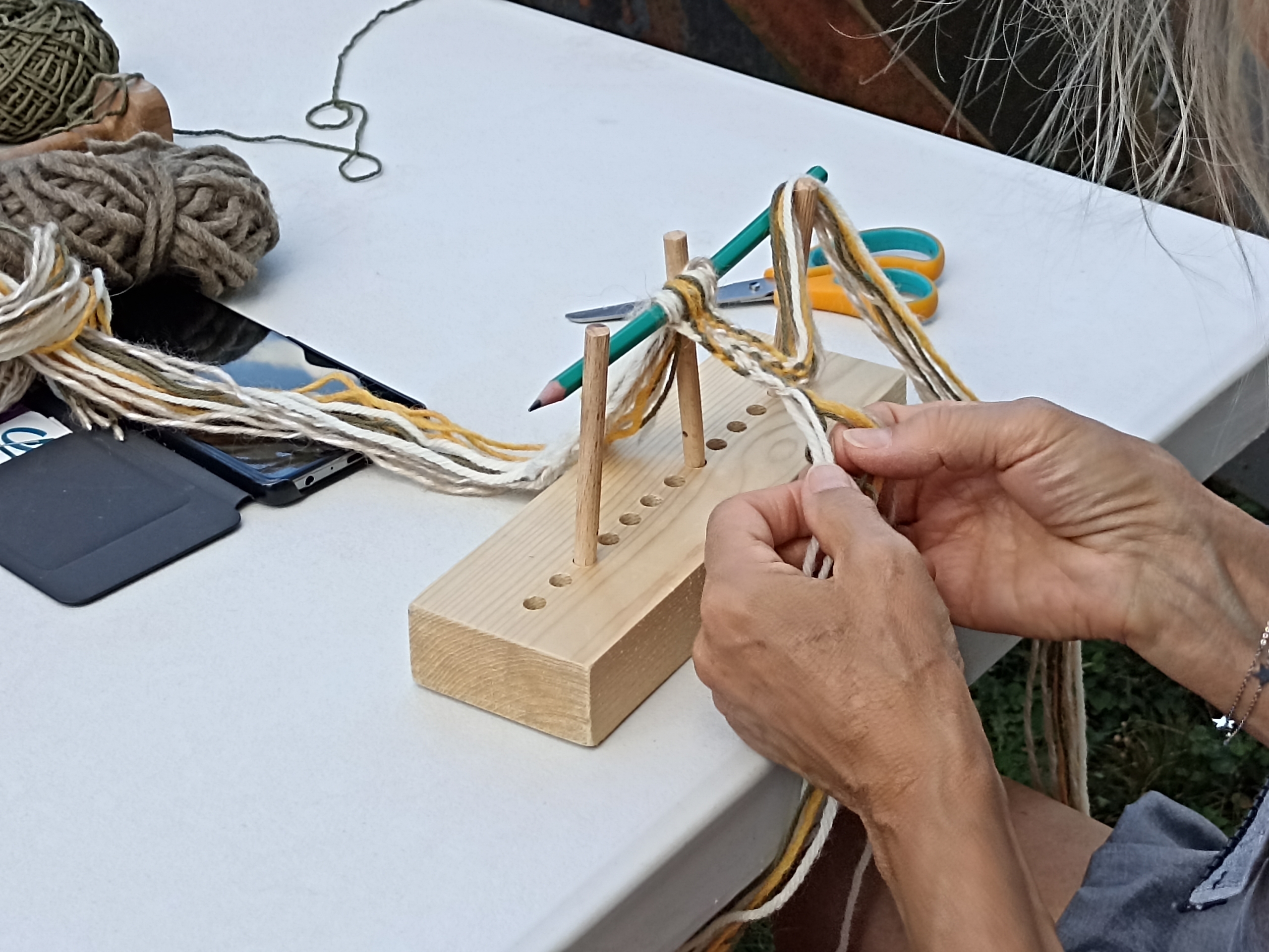 Jour 2 : Tissage avec bâtonnets : les participant·es repartent avec l’objet fait sur place.